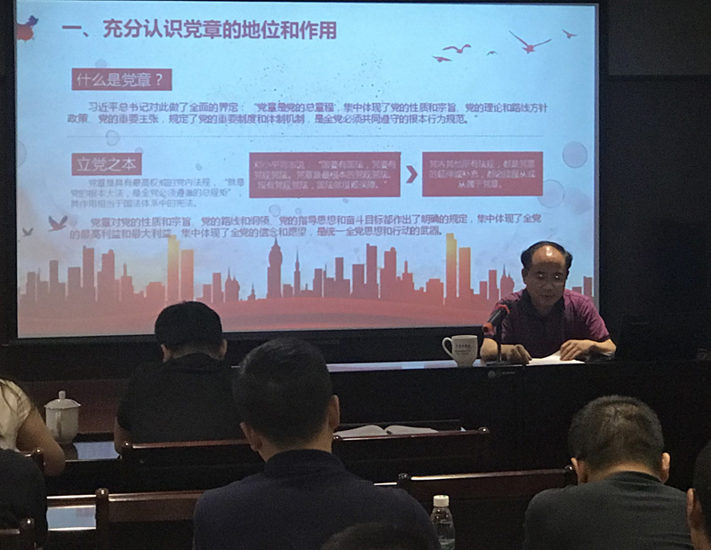 党总支书记、总裁刘健同志在《学习尊崇党章,争做合格党员》的党课中,从党章的地位、作用、历程等方面向党员全面解读了中国共产党章程,从党章规定的党员义务、习总书记系列重要论述及“四讲四有”等角度阐述了合格党员的标准。他希望公司党员自觉以党章、习总书记讲话精神和“四讲四有”为标尺,随时纠正个人的思想和行为,保持思想品德的纯洁,保持工作作风的优良,保持工作绩效的先进,保持个人行为的廉洁,主动融入公司的发展大计,尽职尽责做好本职工作。