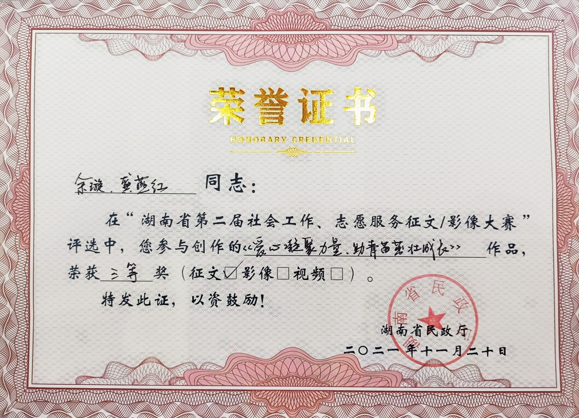 2021年,我司多名员工积极踊跃投稿参与由湖南省民政厅主办、湖南公共频道承办的湖南省第二届社会工作、志愿服务征文暨影像大赛。他们讲述平凡而伟大的故事,展现社会工作者精神风貌,传播真善美,弘扬正能量。其中两篇原创征文作品、三幅原创影像作品在比赛中脱颖而出,荣获一等奖1个、三等奖3个、优秀奖1个。